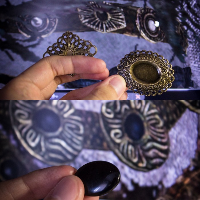 Это было очень долго и кропотливо по причине того, что я заморочилась и искала на АлиЭкспресс сеттинги и металлические филиграни подходящее формой и узором. Так же я нашла камни — чёрные и белые — идеально подходящие для всех ожерелий.