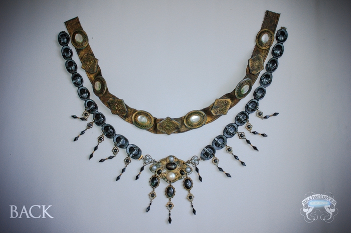 После этого, я дособирала задний «ремень», он же ожерелье, из кожзама, подкрашенного под бронзу и золото и красивых сеттингов/ филиграней с овальными камешками.
