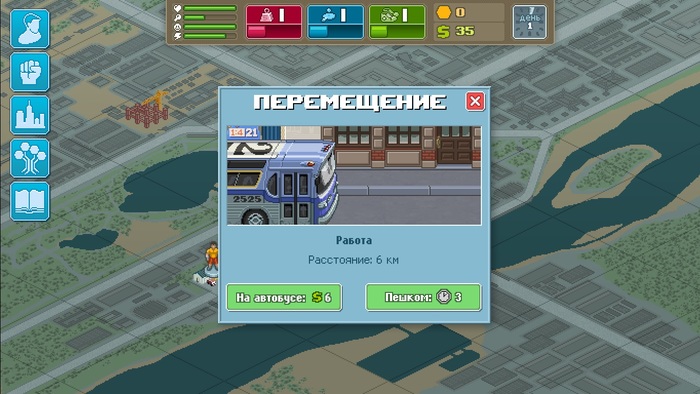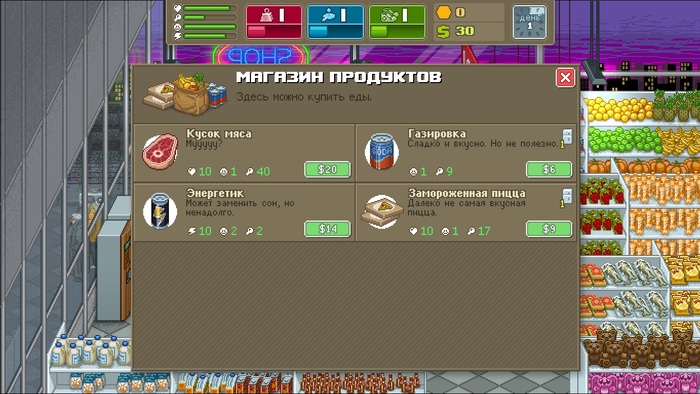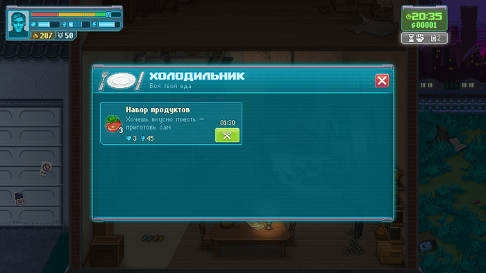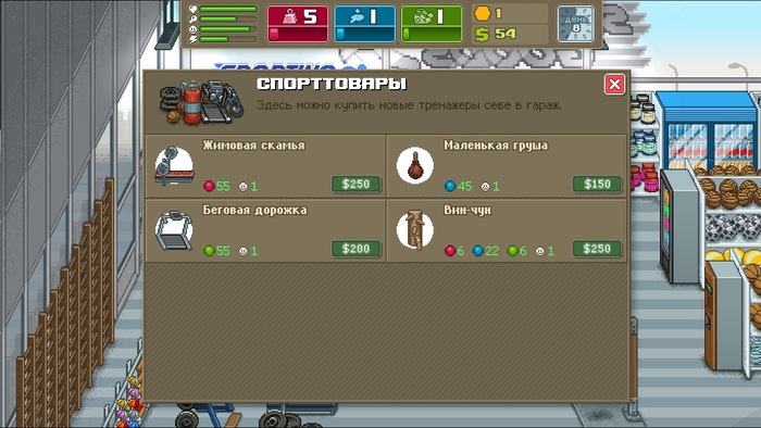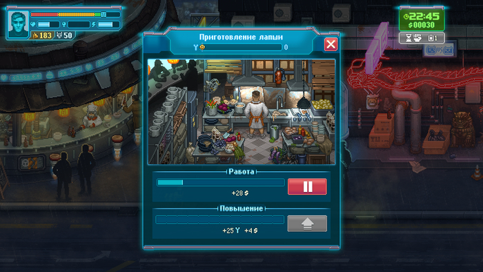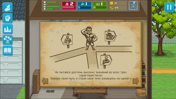 Если же параметр "еда" на нуле, то естественно работать не получится. А без денег, тут не выжить, потому нужно уметь балансировать между тренировками и работой.