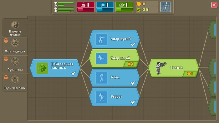 Итак, в начале игры у нас будет мало ударов. Их нужно открывать, а потому необходимо зарабатывать специальные баллы, которые можно будет тратить на "покупку" различных умений. Также, слева можно увидеть путь медведя, путь тигра, и путь черепахи.