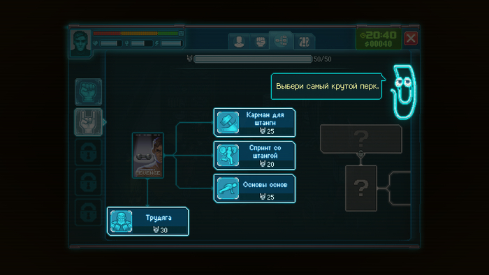 Что же предлагает игра? Кроме того, что тут много отсылок на фильмы, игры, и популярных персонажей, это действительно симулятор бойца. У вас есть возможности, а также цель: стать чемпионом в лиге, а также найти убийцу своего отца. Начинаете с того, что нам нужно получить первый пёрк