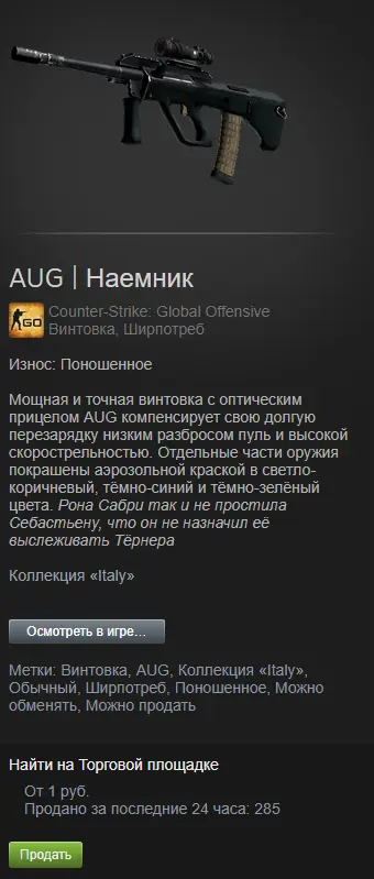 Если хотите быстро продать предмет, ищите минимальное значение относительно рынка. Все цены проставляются через точку. Продавать можно не только карточки, но и скины с предметами. Цена будет варьироваться в зависимости от многих параметров, включая редкость и качество предмета. К примеру, этот базовый скин для Steyr AUG стоит всего 1 рубль.