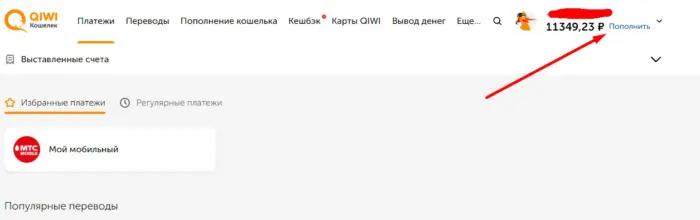 - После успешного пополнения нам нужно найти вкладку «Платежи» на панели сверху