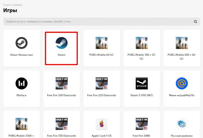 - После, в предоставленном списке ниже находим услугу под названием «Игры» и нажимаем на «Все игры». В открывшемся каталоге выбираем «Steam»