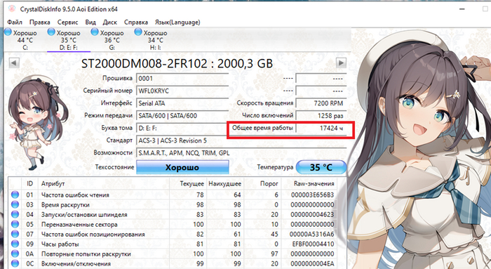 И конкретно в моем случае видим значение 17424 часа. Для этого диска – это нормально. В S.M.A.R.T. значение совпадает.