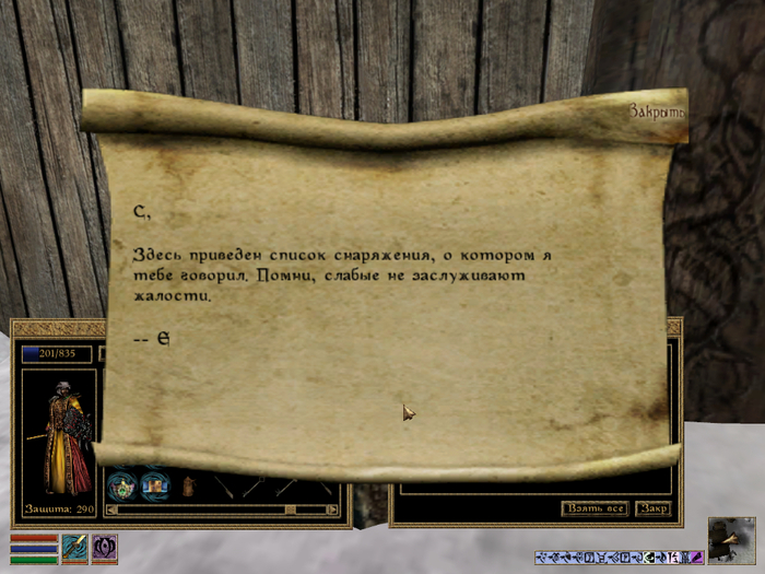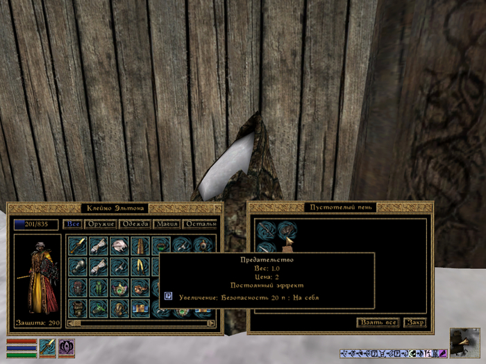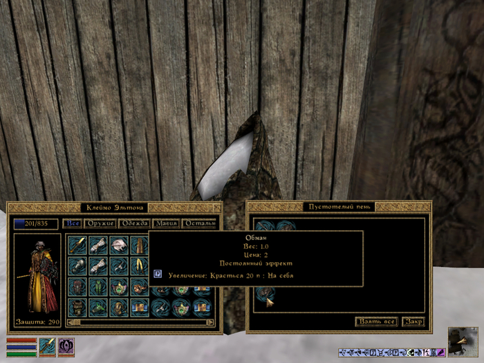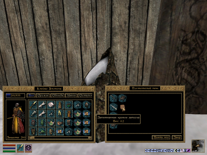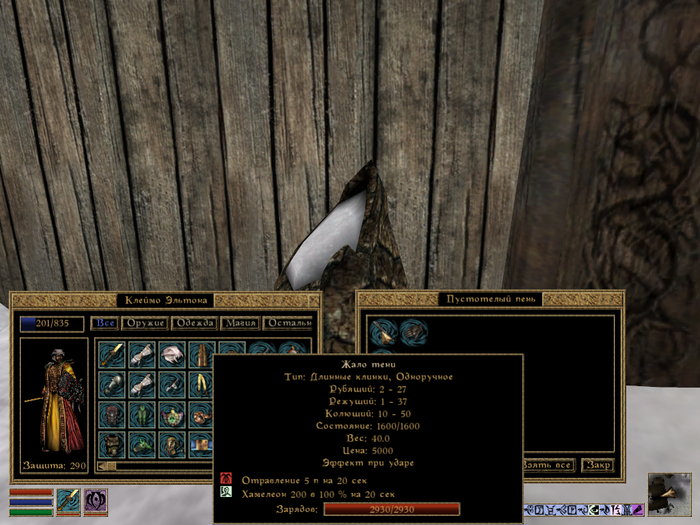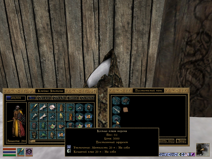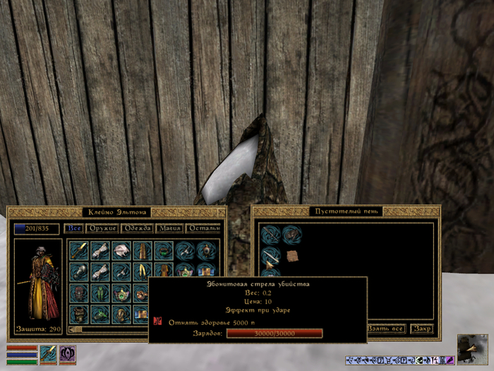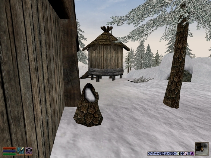 Торчит у задней стены Тирска. Пасхалка от разрабов. Содержит в себе эбонитовый длинный меч Жало тени (колющий урон 10-50), Кольцо глаза ворона (Ночной глаз 20 п. и пост. +20 к Меткости), Перчатки Мораг Тонг (левая с пост. +20 к Скрытности, правая с пост. +20 к Взлому), и пять совершенно читерских Эбонитовых стрел убийства (с эффектом Повредить здоровье на 5000 п.), а также записку, не пойми кому адресованную.