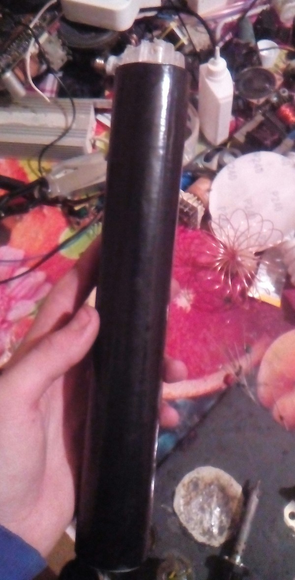 Две половины напечатаны на принтере и склеены суперклеем. Тор - это верхняя обкладка развёрнутого конденсатора, потому он должен проводить электричество. Я обернул его алюминиевым скотчем для вентиляций