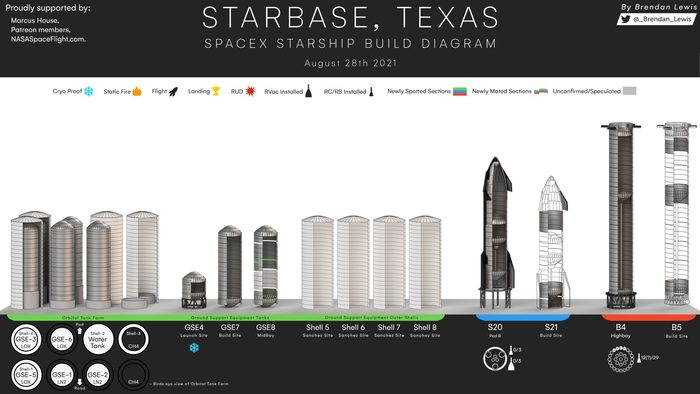 Работы ведутся и с заправочной фермой. Установлен еще один бак GSE, другой накрыли кожухом, последний привезли 31 числа для установки. В принципе, все составляющие уже готовы и остается все окончательно собрать и подключить. Более того, в августе заправка впервые подавала признаки жизни — один из баков явно был испытан в составе фермы. Ну а в дополнение был испытан еще один тестовый бак — GSE test, он прошел криогенные испытания. Возможно, это требовалось для сертификации.
