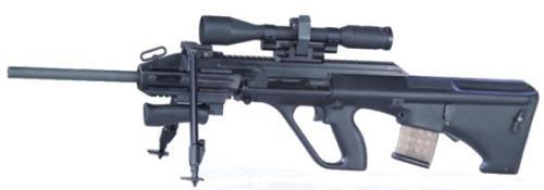 Steyr AUG A3 Sniper с удлиненным стволом, съемными сошками и передней рукояткой, а также оптическим прицелом переменной кратности на быстросъемном кронштейне