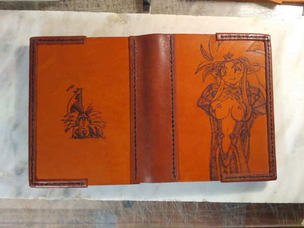 Тут человек выложил обложку из кожи, похвастаюсь и я своей работой двухлетней давности. Первая обложка (под альбом), делалась для себя. Кожа химического дубления (на профессиональном жаргоне- "хром")- 1.5 и 3 мм, пирография (сиречь выжигание по коже). Времени на неё ушло два вечера, в общем и целом- не особенно сложно, просто проба пера.