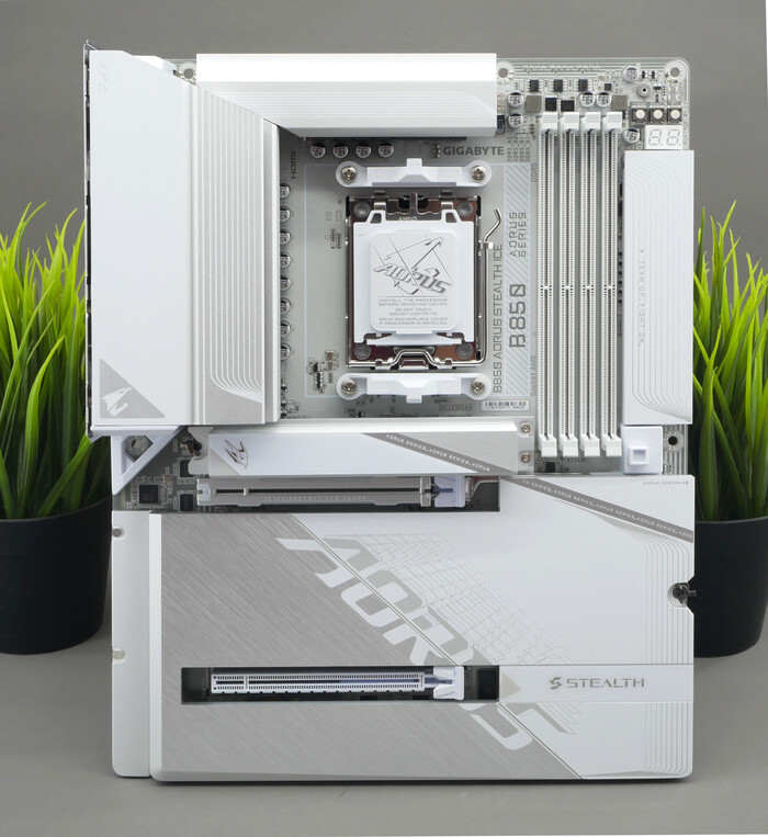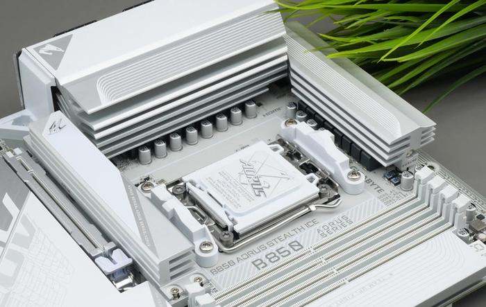 Сердцем материнской платы Gigabyte B850 Aorus Stealth Ice выступает платформа AMD AM5 с поддержкой актуальных процессоров данного сокета. Он окружен вереницей больших ребристых радиаторов с тепловой трубкой.