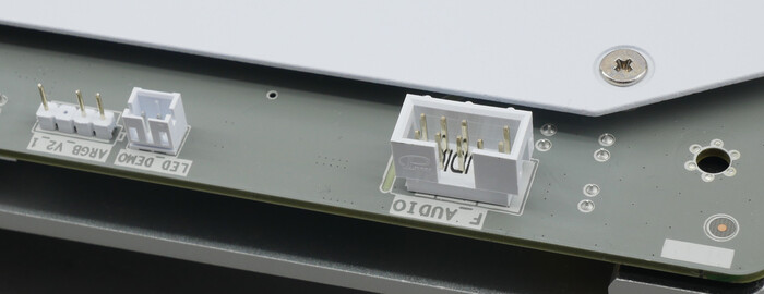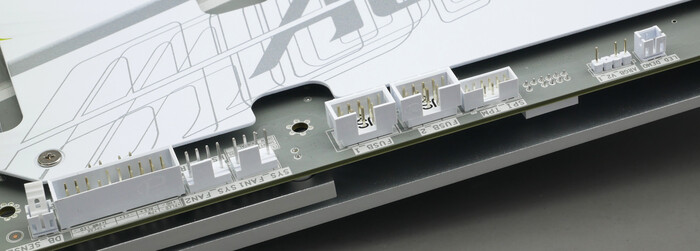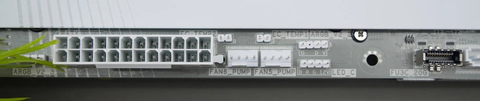 Нижняя секция представлена целым вереницей разъемов, которые потребуют разъяснения и помощи инструкции. Здесь находятся две колодки USB и передней панели корпуса, пара коннекторов для подсветки, порты для термодатчиков, датчика шума, сброса BIOS и TPM.