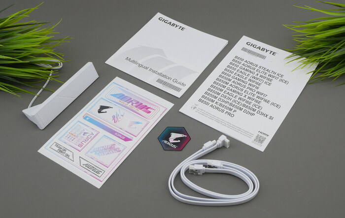 Комплектация новинки включает необходимые компоненты, и исключительно в белом исполнении! Несколько инструкций и брошюр, Wi-Fi-антенна, стикеры и наклейки, пара белых SATA-кабелей, логотип бренда AORUS, винты крепления M.2, переходник для упрощения подключения кабелей передней панели корпуса.