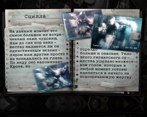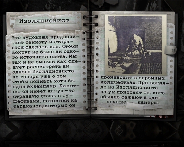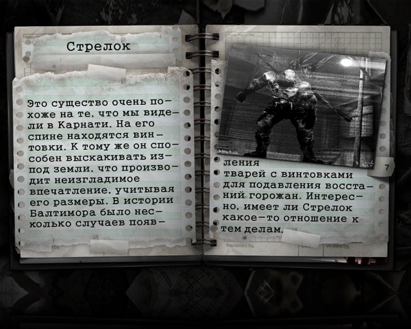 Герой будет носить с собой три дневника с записями: Записная книжка Джордан, с ней мы познакомимся по ходу игры, содержит в себе описание всех встреченных нами существ. Заметки Консуэллы поведают нам об истории Балтимора и жутких тайнах улиц этого города. Консуэлла - это жена охранника тюрьмы Эббот, ее записки о локациях острова Карнати мы видели в прошлой части. И дневник жены Торка - Кармен, в нем содержится информация о событиях и людях, имеющих отношение к семье Торка, так и о нем самом.