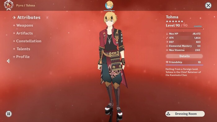 Тома — милый и дружелюбный парень родом из Мондштадта, в настоящий момент, занимающий довольно интересную позицию в Инадзуме. Несмотря на свое происхождение, он является своего рода местным авторитетом, который может найти подход к каждому. Его милая улыбка вряд ли кого-то оставит равнодушным, а его пылающее сердце в синергии с его пиро навыками поможет вам победить не одного Крио мага Бездны.
