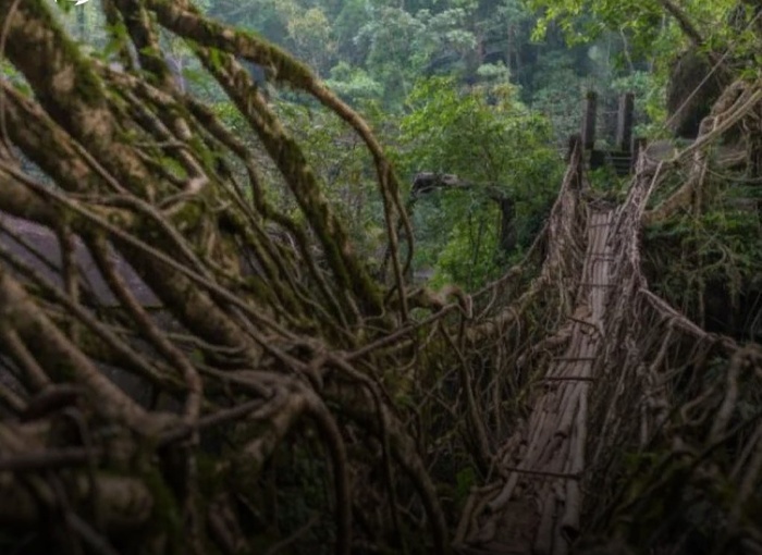 Ещё в некоторых штатах есть реальные живые мосты, которым уже 5000 лет. Они сделаны из корней деревьев и лиан. Местные в прошлом как-то умудрялись их направлять через реки и обрывы. И спустя время вырастали вот такие мостики. Далее их укрепляли, вязали и получалась переправа.