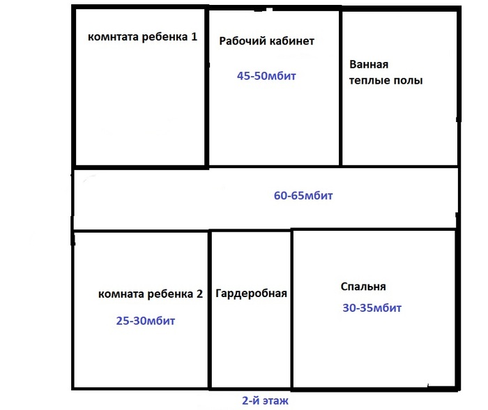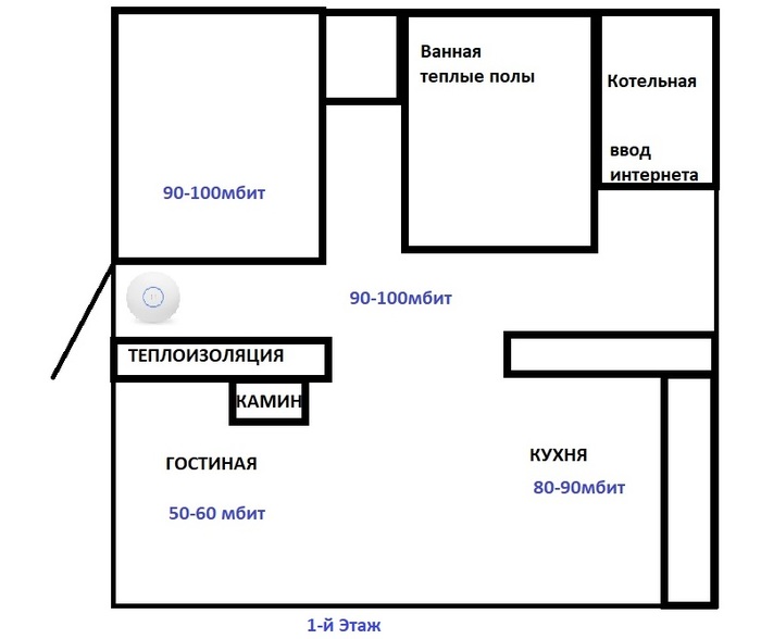 p.s. Почему скорость будет не 100, а всего лишь 50? потому что когда мы выкрутим мощность точки доступа на максимум, рядом с ней возникнут паразитные отражения и jitter(неровность сигнала) что помешает достичь максимально возможных по стандарту скоростей... А если мы не будем выкручивать мощность, то рядом с точкой доступа будет 80-100мбит, через пару стен 40-50мбит, а в углах дома 15-20мбит.... выход из этой ситуации ставить вторую точку доступа, но это увеличивает цену проекта на 8-10т.р
