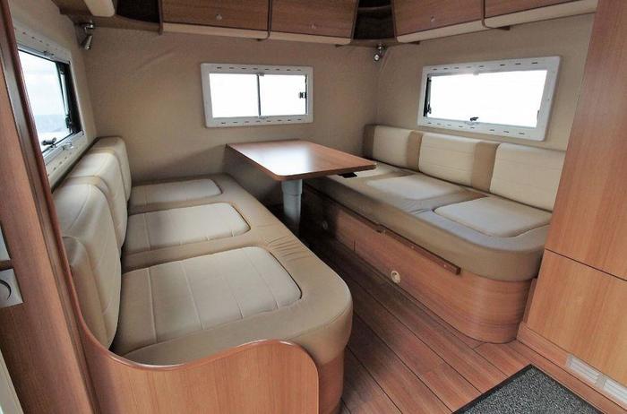 В компании отмечают, что автомобиль можно эксплуатировать при любых погодных условиях и температуре от -40 до +40 градусов по Цельсию. Крыша и стены модуля изготовлены по особой технологии: они не пропускают холод, а в жару можно открыть люк или окна (всего их три). На каждом окне имеются затемняющие шторки и противомоскитные сетки.