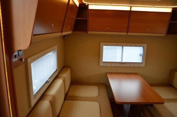 Также в модуле предусмотрены четыре посадочных места, которые трансформируются в двухметровую кровать, антресоли, полки и шкаф для хранения одежды, холодильник, микроволновка и выносной душ.