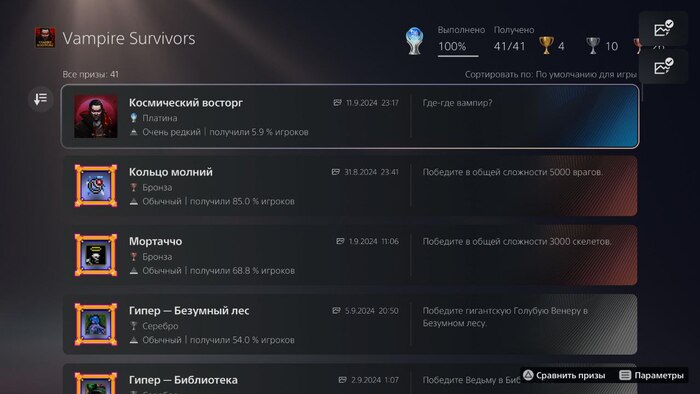 За 37 часов выбил платиновый трофей в игре Vampire Survivors на PlayStation 5.