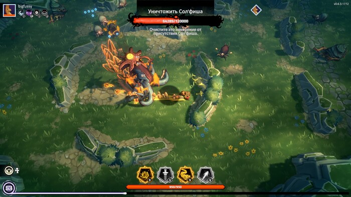В конце забега является босс — здоровенный бродячий цветок. Каких-то затруднений лично у меня он не вызывает. Пока заявлен и выявлен один единственный вид босса, что очень и очень мало для подобных игр.