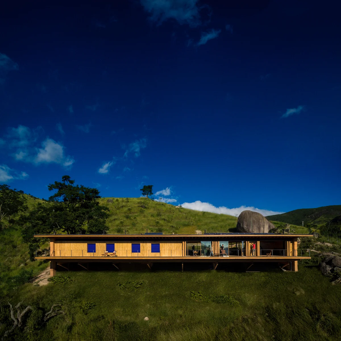Сборный дом Catuçaba в Бразилии возвышается на сваях, он облицован окнами от пола до потолка, из которых открывается вид на суровый сельскохозяйственный ландшафт.