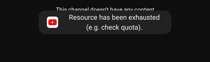 Я сидел на Ютубе и на днях начало вылезать ошибка " Resource has been exhausted (e.g. check quota). " , я на это не обращал сильно внимания ведь бывают моменты когда телефон глючит, и всё нормально думал.